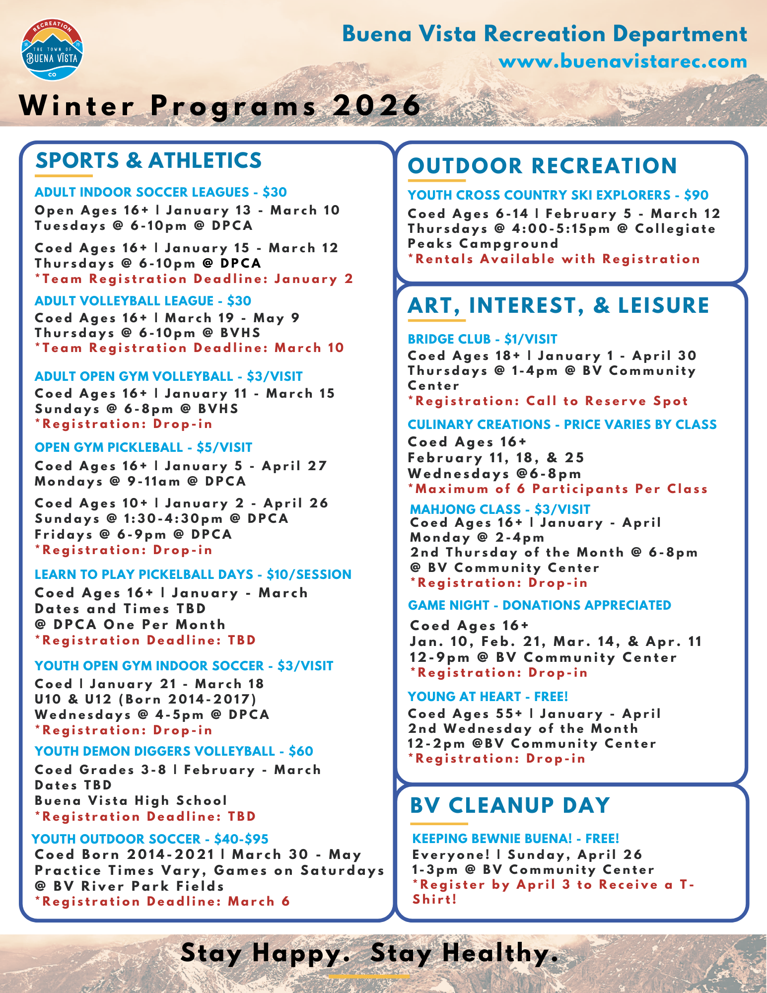 As you explore local programs online, you can sign up instantly! You can also print the Registration Form below and return it by mail (PO Box 2002, Buena Vista, CO 81211) or drop it off at Town Hall (210 E Main Street). Please contact us or the specific program organizer with any questions!