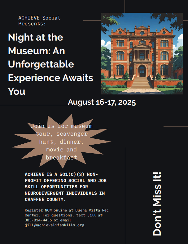 Buena Vista Heritage Museum 506 E Main Street, Buena Vista, CO, United StatesAchieve Social Outing: Night at the Buena Vista Heritage Museum! Coed Ages: 14 and Older $5/Participant Saturday, August 16 and Sunday, August 17, 2025 Registration Deadline: Wednesday, August 13, 2025 at 5:00pm Buena Vista Recreation is excited to partner with Achieve, Inc to offer stand-alone Achieve Social programs designed to support and include neurodivergent individuals, […]