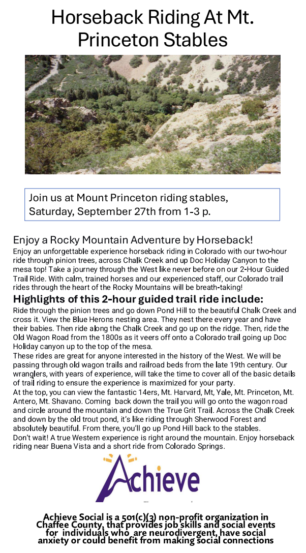 Mt. Princeton Riding Stables 14582 County Road 162, Nathrop, United StatesAchieve Social Outing: Horseback Riding at Mt. Princeton Riding Stables Coed Ages: 14 and Older $5/Participant Saturday, September 27, 2025 Registration Deadline: Monday, September 22 Buena Vista Recreation is excited to partner with Achieve, Inc to offer stand-alone Achieve Social programs designed to support and include neurodivergent individuals, including those on the autism spectrum, with […]